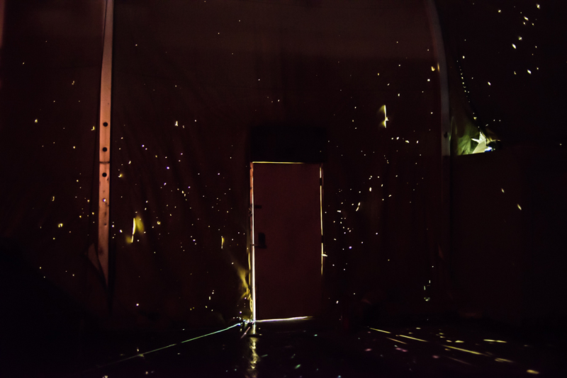 An aircraft hangar peppered with shrapnel from a Taliban rocket attack glows like a spray of stars at Jalalabad Airfield.