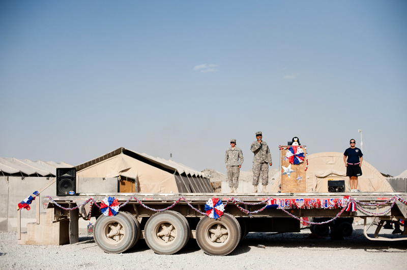 A soldier sings the US national anthem during a Fourth of July celebration at Kandahar Airfield. No holiday, no matter how small, can pass unremarked by soldiers at the large airfields. Home to the command staff and many support troops, these megabases offer broad choices of food and entertainment, while soldiers at far-flung combat outposts live in an atmosphere of austerity and relentless violence.