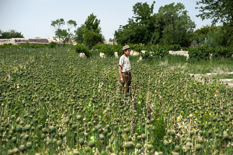A boy stops harvesting opium from this poppy field in Kandahar’s Zhari District to watch patrolling soldiers pass by. Every spring this boy and his family travels from Uruzgan to make money harvesting opium in Kandahar. US soldiers no longer get involved in poppy eradication, as it undermines their primary mission of pacifying the population. Local authorities are tasked with eradication, but they will always look the other way for a bribe. According to the United Nations Office on Drugs and Crime, Afghanistan supplies the raw materials for 90 percent of the world’s heroin.